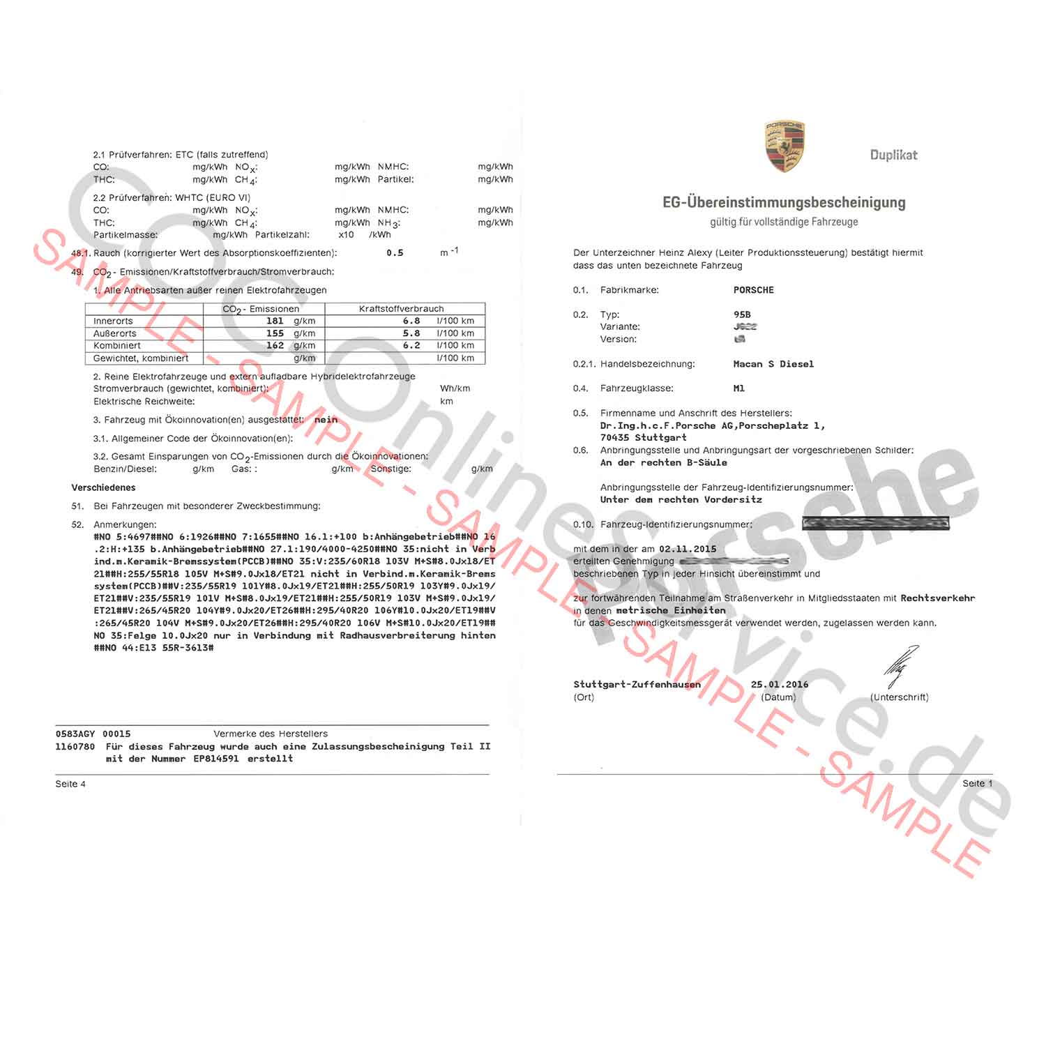 COC Papers for Porsche (Certificate of Conformity)